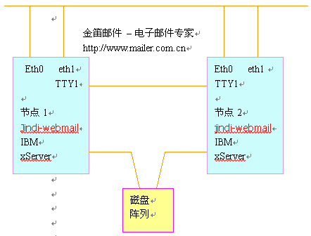 本項目采用金笛集群郵件系統(tǒng),通過兩臺IBM PC服務器實現(xiàn)高可用性。支持SMTP, POP3,IMAP等主流協(xié)議,支持WebMail,支持郵件列表等功能,同時要求兼容性好,與網(wǎng)站其他業(yè)務系統(tǒng)沒有沖突。