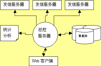 1. 以總控服務(wù)器為控制中心,控制一臺(tái)或多臺(tái)郵件發(fā)送服務(wù)器,每臺(tái)發(fā)送服務(wù)器管理一個(gè)或多個(gè)郵件隊(duì)列?刂浦行目刂凄]件列表,任務(wù)列表、作業(yè)列表,并與業(yè)務(wù)數(shù)據(jù)庫通過數(shù)據(jù)庫接口連接,根據(jù)條件提取數(shù)據(jù),更新郵件發(fā)送列表,生成統(tǒng)計(jì)分析報(bào)告。