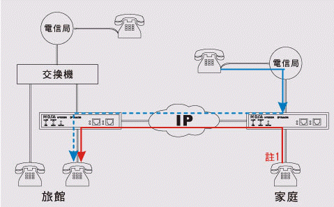 在旅館里亦可利用公司FONEMOSA遠(yuǎn)易通撥出電話及收聽語音信箱 將FONEMOSA遠(yuǎn)易通在旅館房間裝設(shè)好后,可以在旅館里免費(fèi)使用各地分公司交換機(jī)所有功能,撥接電話就像在辦公室一樣,也可以撥接其它同仁分機(jī)電話,或者聽取語音留言,舉凡各類公司交換機(jī)功能,在旅館里都一樣可以使用。(圖標(biāo): On-Net Call 網(wǎng)內(nèi)互打, 紅色線路)