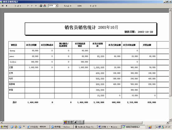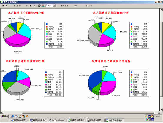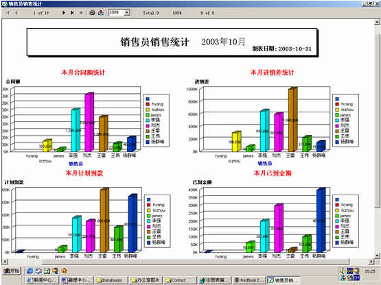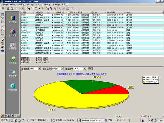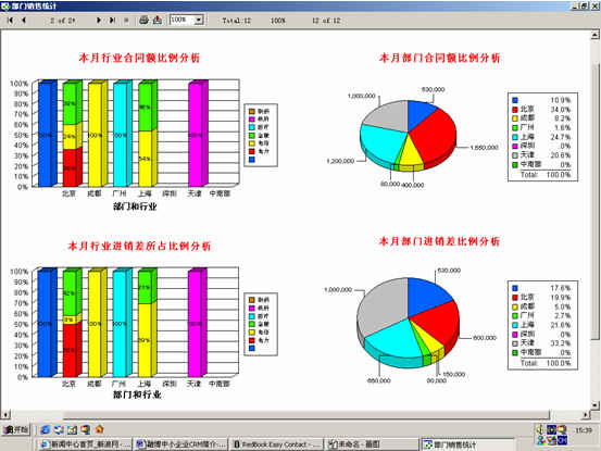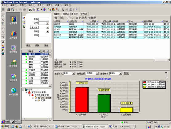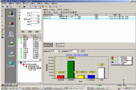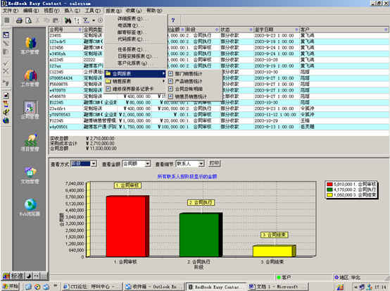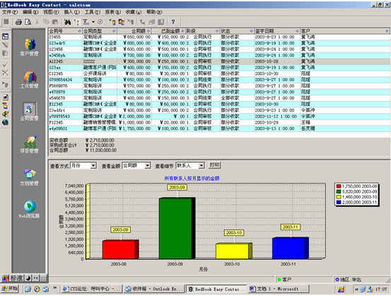 可對客戶(雇員)合同,根據(jù)合同階段、月份、合同金額、合同應(yīng)收應(yīng)付款、采購成本、客戶、銷售人員等條件進行查詢和統(tǒng)計, 查詢統(tǒng)計結(jié)果以詳細列表及圖示進行顯示。