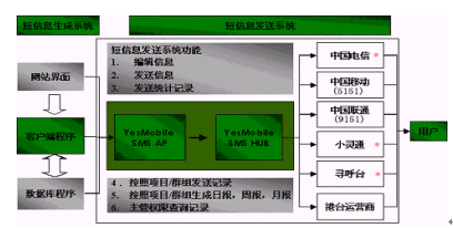 ·由YesMobile提供Api程序包,用戶按照技術(shù)規(guī)范開發(fā)Web或客戶端程序完成接入,通過YesMobile的短信平臺(tái)向用戶指定客戶發(fā)送信息;