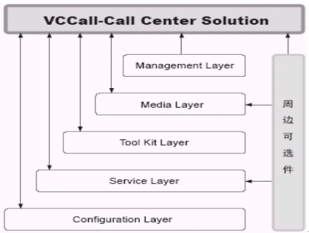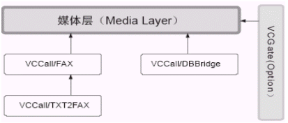 Media Layer由VCCall/DBBridge、VCGate(Option)、VCCall/FAX、VCCall/TXT2FAX、VCCall/FAX、VCCall/TXT2FAX組成VCCall媒體層提供了除電話之外進(jìn)行交互的其他媒體組件,包括:傳真VCCall/FAX、數(shù)據(jù)庫(kù)訪問媒體VCCall/DBBridge。