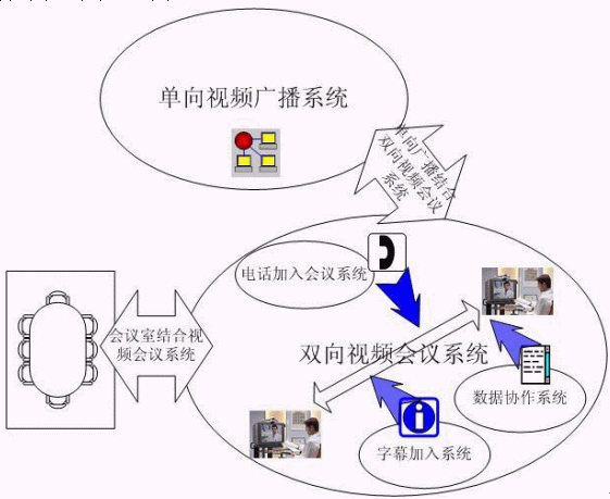 雙向視頻會議系統(tǒng)是實(shí)現(xiàn)視頻會議基本功能的主要系統(tǒng),其他均為輔助的子系統(tǒng)。