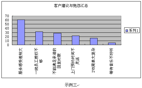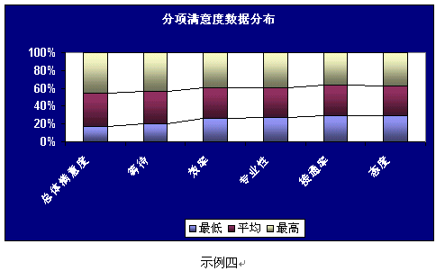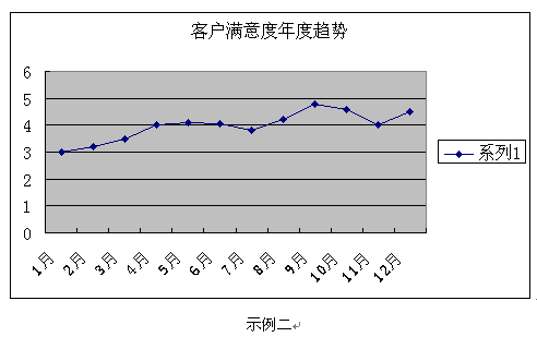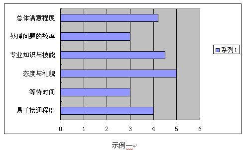 客戶(hù)滿(mǎn)意度調(diào)查的數(shù)據(jù)及分析結(jié)果應(yīng)該以一種易讀易解的方式呈現(xiàn)。圖表的形式總是比單純、枯燥的EXCEL表格和長(zhǎng)篇大論更容易被人理解并留下深刻印象。常用的圖表形式示例如下:
