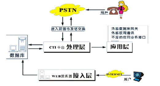 (1)接入層:主要負(fù)責(zé)公網(wǎng)(固定網(wǎng)、移動(dòng)網(wǎng)、互聯(lián)網(wǎng))與系統(tǒng)相接的部分,處理電話呼入/呼出的信令、話路的交換;互聯(lián)網(wǎng)的接入、數(shù)據(jù)的處理。