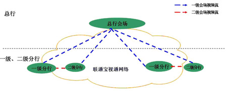 傳輸層:采用網(wǎng)通“寶視通”視頻會議運營網(wǎng),該網(wǎng)架構(gòu)在網(wǎng)通IP數(shù)據(jù)骨干網(wǎng)和本地傳輸與接入網(wǎng)之上的業(yè)務(wù)網(wǎng),采用H.264協(xié)議,面向民生行提供可管理的商用視頻會議網(wǎng)。