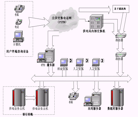 (3)自動(dòng)轉(zhuǎn)人工服務(wù)。系統(tǒng)還可自動(dòng)轉(zhuǎn)接人工坐席,由電力專業(yè)人員負(fù)責(zé)解答和處理客戶意見;蛘邔⒖蛻舴⻊(wù)中心系統(tǒng)與后臺數(shù)據(jù)庫服務(wù)器相接,通過客戶提供的相關(guān)信息,為客戶提供個(gè)性化的在線服務(wù)。