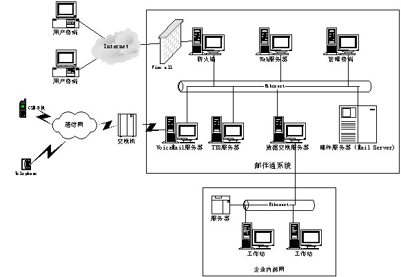 對于不同類型消息呼入、呼出的外圍系統(tǒng)設計遵循模塊化原則;系統(tǒng)內(nèi)部消息流滿足格式統(tǒng)一、可操作性統(tǒng)一、開發(fā)接口統(tǒng)一等特點。在軟、硬件選型上,充分考慮系統(tǒng)的穩(wěn)定性、開放性、經(jīng)濟性,根據(jù)不同的系統(tǒng)規(guī)模進行詳細論證。