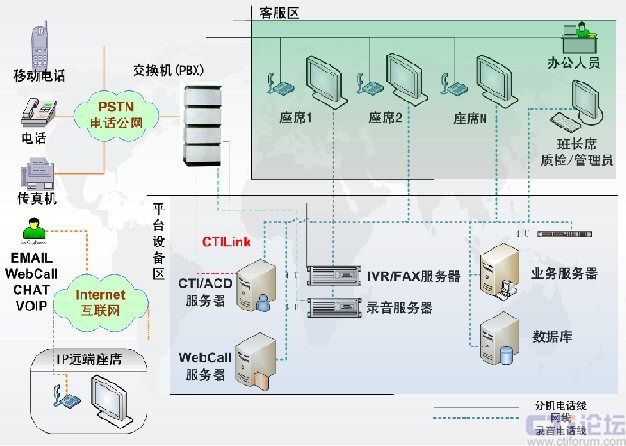 包含了排隊(duì)機(jī)、CTI服務(wù)器、IVR/FAX服務(wù)器、錄音監(jiān)控 、智能外呼、工作流、報(bào)表統(tǒng)計(jì)系統(tǒng),CRM業(yè)務(wù)集成等。