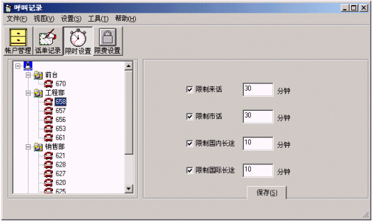 ·分機(jī)限時(shí)功能:針對(duì)特定分機(jī)根據(jù)不同的呼叫類型(國(guó)際長(zhǎng)途、國(guó)內(nèi)長(zhǎng)途、市話、來(lái)話等)設(shè)置不同的通話時(shí)長(zhǎng)限制;