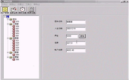 ·團(tuán)體限費(fèi)功能:多個(gè)分機(jī)組成一個(gè)團(tuán)體,針對(duì)團(tuán)體內(nèi)的每一個(gè)分機(jī)根據(jù)呼叫類型限制通話費(fèi)用,可以實(shí)現(xiàn)團(tuán)體的押金管理;
