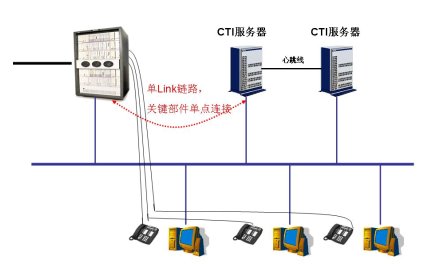 中汽網(wǎng)呼叫中心采用了Hi-Link產(chǎn)品的鏈路級雙機(jī)熱備解決方案,為核心部件CTI提供真正可靠的保障。以往的CTI產(chǎn)品在與PBX連接的時(shí)候,都是采用PBX廠家提供的“API層”接口,該接口只能部署到一臺服務(wù)器上,進(jìn)而也使得采用雙機(jī)熱備方案的CTI服務(wù)器存在單點(diǎn)故障,如圖所示: