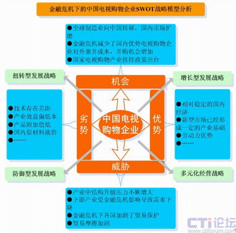 1992年至2009年以來(lái),電視購(gòu)物經(jīng)歷了從割據(jù)到統(tǒng)一,全國(guó)購(gòu)物頻道網(wǎng)絡(luò)化;從粗放到科學(xué),頻道運(yùn)營(yíng)模式專業(yè)化;從簡(jiǎn)介到深度,頻道編排方式規(guī)律化、從滯后到及時(shí),物流配送體系成熟化。電視購(gòu)物被譽(yù)為繼零售、超市之后的第三次銷售革命,電視購(gòu)物將成為金融危機(jī)經(jīng)濟(jì)形態(tài)下未來(lái)中國(guó)電視新的經(jīng)濟(jì)增長(zhǎng)點(diǎn),而付費(fèi)電視、數(shù)字網(wǎng)絡(luò)電視的發(fā)展,是中國(guó)電視購(gòu)物市場(chǎng)新的戰(zhàn)略機(jī)會(huì)。金融危機(jī)下的中國(guó)電視購(gòu)物企業(yè)SWOT戰(zhàn)略模型分析如下: