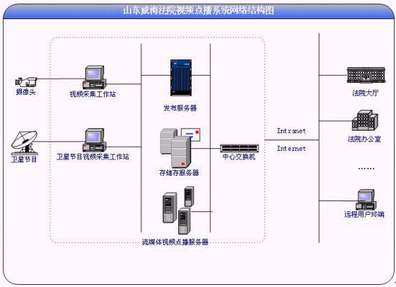 威海中級人民法院VOD應用建設包括:用戶認證系統(tǒng)、遠程上傳系統(tǒng)、內(nèi)容分發(fā)系統(tǒng)、內(nèi)容播放系統(tǒng)(流媒體)、網(wǎng)站內(nèi)容系統(tǒng)等部分。