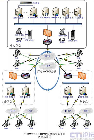 根據(jù)以上情況,廣電系統(tǒng)的流媒體服務平臺采用VIEWGOOD流媒體服務平臺,利用HP2P、WCDN技術進行分級部署;以下給出網(wǎng)絡拓撲圖: