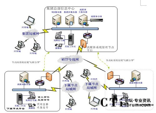 2、集團與各下屬節(jié)點之間采用MSTP專線連接,可實現(xiàn)集團總部視頻資源、網(wǎng)絡(luò)電視直播資源分發(fā)至各分節(jié)點;最終實現(xiàn)集團總部和各下屬單位可以互聯(lián)分享各種實況直播、培訓(xùn)視頻資源等。
