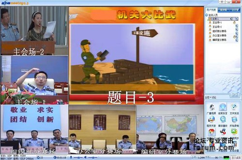 本次架設(shè)的空軍大比武平臺,滿足了總部主持指揮協(xié)調(diào)和各二級部參加比賽的應(yīng)用?偛颗c各二級部分別架設(shè)網(wǎng)動視頻會議硬件終端,分會場觀眾通過登錄網(wǎng)動統(tǒng)一通信平臺Active UC®觀看實時比賽畫面,并與現(xiàn)場互動、點(diǎn)評?偛恐鞒秩丝晒蚕韰①惒块T的答題桌面,把答題結(jié)果展現(xiàn)給評委和各會場觀眾。系統(tǒng)可實現(xiàn)舉手搶答,答題結(jié)果實時上傳等貼心功能。