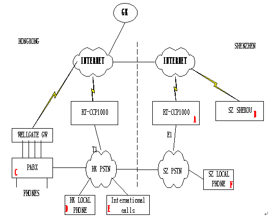 在深圳A點(diǎn)的CCP1000放置在辦公室,使用E1接入本地PSTN,深圳CCP1000即可以通過Internet呼出到香港,也可以通過E1呼出到香港。本地號(hào)碼資源申請(qǐng)100個(gè)號(hào)碼,號(hào)碼資源為6***1100-6***1199,本CCP1000下暫時(shí)只接32部模擬電話,假設(shè)是6***1100-6***1131,并且作為集團(tuán)內(nèi)部電話,可以使用4位短號(hào),可以設(shè)定申請(qǐng)到的電話的后四位為短號(hào),即1100-1131。香港的辦公室使用WellTech的Gateway,具有2次撥號(hào)功能,因此我們只需要分配一個(gè)短號(hào)1000給該Gateway。深圳B點(diǎn)的辦公室只有幾部電話,采用Gateway,分配真實(shí)號(hào)碼:6***114x和短號(hào)1200-1299給B點(diǎn),從上述分析可以得出號(hào)碼規(guī)劃如下: