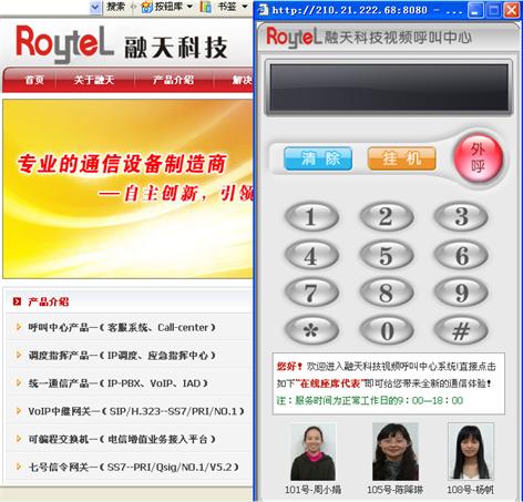 融天科技視頻呼叫中心都采用了非常先進的Web-Call和視頻通信技術,將軟電話控件嵌入到企業(yè)網(wǎng)站上,而對于企業(yè)來說一切都變得非常簡單,無論何時何地,客戶在訪問企業(yè)網(wǎng)站時,可以通過傻瓜式的WEB界面點擊在線視頻座席,只要客戶PC裝有麥克風和攝像頭即可以網(wǎng)頁方式進行面對面的進行視頻和語音交流,同時也能向用戶播放相關的產(chǎn)品資訊,讓您抓住即將流失準客戶,直接為您的企業(yè)創(chuàng)造價值。