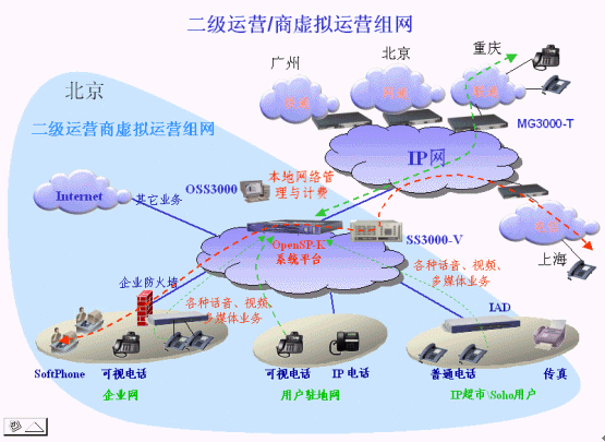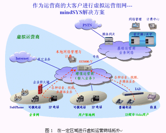 對于希望投資低啟動快的虛擬運營商,我們設計了mindSYS解決方案。在mindSYS解決方案中,以SS3000-V作為核心的呼叫控制、業(yè)務管理和計費平臺,配合中繼網(wǎng)關(guān)MG3000-T以及眾多的接入終端,組成一個完整的解決方案。該方案可以滿足虛擬運營商的初期業(yè)務發(fā)展,有強大的組網(wǎng)適應性和良好的管理計費功能,并具備極好的可擴展性,可以根據(jù)用戶的業(yè)務發(fā)展,平滑升級到更強大的增值業(yè)務、運營管理計費平臺--OpenSP-K平臺,無縫過渡到完善的大規(guī)模虛擬運營解決方案。