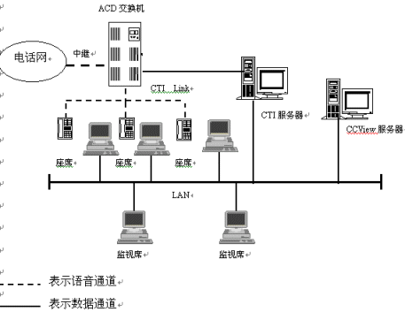 在呼叫中心系統(tǒng)中,ACD交換機(jī)除提供語(yǔ)音接入外,還提供高效的ACD(自動(dòng)來話分配)功能,在本系統(tǒng),若需要監(jiān)視座席話機(jī)的狀態(tài),還必須提供計(jì)算機(jī)電話集成CTI功能。