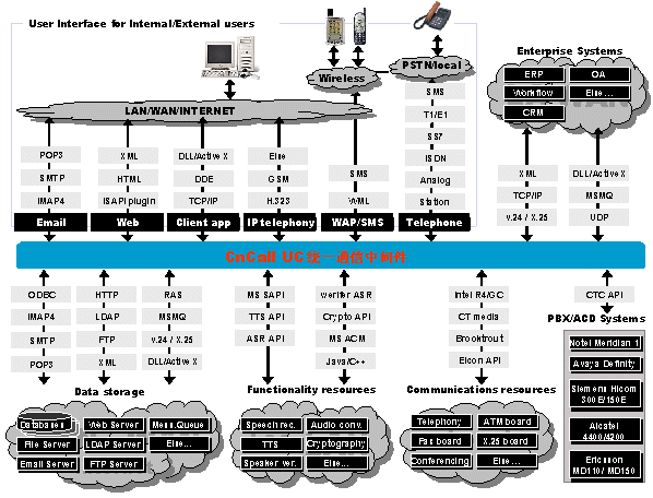 UC統(tǒng)一通信平臺是通信開發(fā)平臺的世界領(lǐng)先者, 提供功能強大而又迅速的開發(fā)技術(shù)來建立復雜的企業(yè)通信服務(wù)。這些技術(shù)包括CTI,傳真,數(shù)據(jù)通信,電子郵件,VXML, HTML,ASR,TTS, WAP,數(shù)據(jù)庫接入等。標準接口讓我們方便的與企業(yè)CRM、ERP、OA等系統(tǒng)連接。