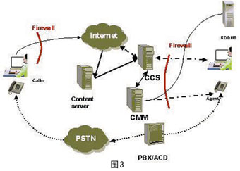 ----圖2說明了在集成互聯(lián)網(wǎng)電話網(wǎng)關(guān)時進行協(xié)同會話的流程,圖中實線為數(shù)據(jù)信息傳遞的鏈路,虛線為語音傳遞的鏈路。通過ITG和PBX/ACD 的特定交互接口,將呼叫中心外部的IP電話鏈路集成到CCIS系統(tǒng)中。值得注意的是,ITG 和CCS需要安裝在企業(yè)防火墻的外側(cè),以方便呼叫者的訪問。