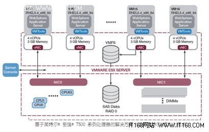 另外,由于電信行業(yè)的特殊性,許多舊的應(yīng)用無法快速有效的部署在新平臺下,造成服務(wù)器利用低,服務(wù)器的數(shù)量越來越多的問題,為此,英特爾與東軟也從幾年前開始進(jìn)行密切合作,在早期的英特爾至強(qiáng)7300、至強(qiáng)7400、至強(qiáng)7500等一系列四路高端服務(wù)器平臺上搭建了虛擬化解決方案,使過去電信舊的應(yīng)用能夠很快在新平臺上進(jìn)行部署。下圖顯示的是東軟以兩臺基于英特爾至強(qiáng) 7500 系列處理器的四路服務(wù)器為基礎(chǔ),構(gòu)建了整個(gè) BSS 架構(gòu):
