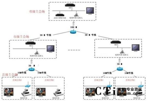 本方案整體采用基于IP網(wǎng)絡(luò),在省、市中心機(jī)房放置MCU,通過網(wǎng)線接入核心交換網(wǎng)絡(luò);在會議室放置視頻終端,通過郵政專網(wǎng)進(jìn)行互聯(lián)。一級系統(tǒng)以省中心會議室為主會場,下屬各市會議室為分會場組成邏輯星形拓?fù)浣Y(jié)構(gòu);二級系統(tǒng)以市州郵政局會議室為主會場,下屬各區(qū)縣郵政局會議室為分會場。兩級系統(tǒng)通過MCU級聯(lián)互通,形成一個(gè)樹形的拓?fù)浣Y(jié)構(gòu)。系統(tǒng)主要由全視頻會議管理系統(tǒng)、純硬件MCU、純硬件1080P高清會議終端等組成,采用MCU為中心的星形結(jié)構(gòu)建立一個(gè)數(shù)字連接的、專業(yè)的視頻會議系統(tǒng)。視頻會議系統(tǒng)可由省郵政廳視頻會議中心控制,任意切換參會市、州(分中心)、縣、市、區(qū)(終端)的會議畫面。視頻會議系統(tǒng)可以指定任意參會單位發(fā)言并實(shí)現(xiàn)全省會場統(tǒng)一的畫面切換。視頻會議系統(tǒng)可實(shí)現(xiàn)省郵政局集中控制與管理,易于使用,能進(jìn)行遠(yuǎn)程管理、遠(yuǎn)程維護(hù)、可降低維護(hù)成本。通過授權(quán),各級單位可自行組織、控制會議,方便各級單位的使用。
