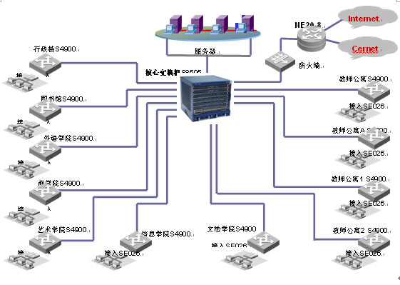 武漢科技大學(xué)全網(wǎng)采用華為3Com網(wǎng)絡(luò)產(chǎn)品,實現(xiàn)語音、數(shù)據(jù)、視頻(課件)等綜合業(yè)務(wù)的承載,為了構(gòu)建基礎(chǔ)網(wǎng)絡(luò)平臺,華為3Com選用Quidway? S8505萬兆核心路由交換機作為整個網(wǎng)絡(luò)的核心,以高密度、大容量的轉(zhuǎn)發(fā)性能為豐富的業(yè)務(wù)提供支持。Quidway? S8505萬兆核心路由交換機具備178Mpps的處理能力,300G的交換容量,并可以升級到600G;接入采用為教育行業(yè)定制的E026/E050交換機,實現(xiàn)整網(wǎng)的安全接入的完善的帶寬管理功能。網(wǎng)絡(luò)出口采用NE20-8第五代路由器實現(xiàn)雙出口,實現(xiàn)靈活的路由策略。