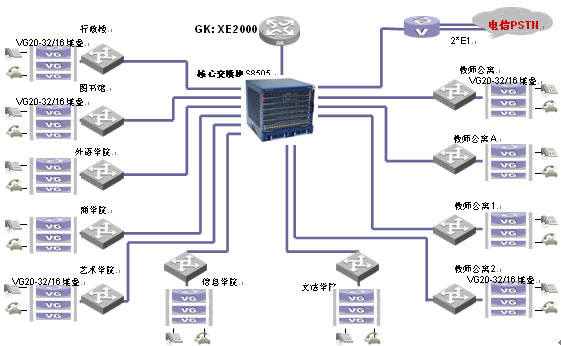 IP語音網(wǎng)采用華為3Com全系列語音視訊產(chǎn)品。為了滿足學(xué)校通訊的需求,華為3Com選用Quidway XE2000 IP PBX語音服務(wù)器作為核心呼叫控制設(shè)備,作為獨立控制的語音服務(wù)器,網(wǎng)絡(luò)規(guī)劃完®全自主,實現(xiàn)快速部署。采用50余臺ViewPoint® 8220p桌面可視終端和Quidway® VG20-32/VG20-16, VG80-20語音網(wǎng)關(guān)滿足用戶不同層次的業(yè)務(wù)接入需求。
