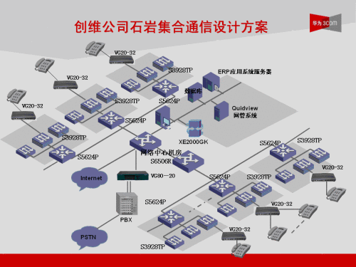 整個(gè)解決方案大量使用了華為3Com公司自主研發(fā)的XE2000、VG80-20、VG20-32、VG20-16、VG21-08等一系列VOIP系統(tǒng),整個(gè)石巖基地語音點(diǎn)數(shù)覆蓋1500點(diǎn)以上,未來發(fā)展可以擴(kuò)展到2500點(diǎn)。
