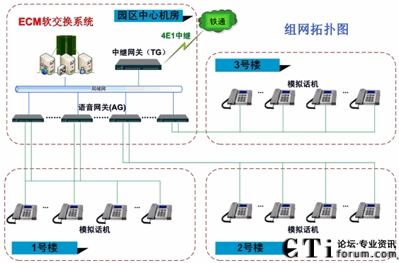 基地先完成機房到桌面的弱電布線,在大樓中心骨干機房,架設一套ECM軟交換系統(tǒng)組建電話通訊網(wǎng)絡。