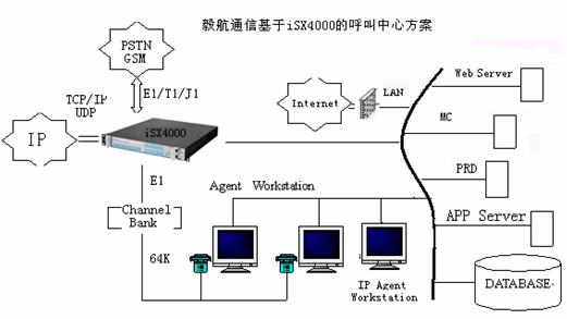 相對(duì)于現(xiàn)在的兩種主流呼叫中心方案,毅航通信基于iSX4000呼叫中心解決方案直接整合了Internet的接入。傳統(tǒng)由IVR完成的操作也可以通過Web頁(yè)面上的流程實(shí)現(xiàn),這樣用戶通過下拉菜單、簡(jiǎn)單填寫、點(diǎn)擊按鈕等操作完成客戶識(shí)別、業(yè)務(wù)識(shí)別等操作,這些流程完成后,通過VoIP對(duì)呼叫中心呼入,由呼叫中心對(duì)呼入進(jìn)行受理,再按照相應(yīng)的原則分配到座席,座席再作相應(yīng)的應(yīng)答和處理,從而為客戶提供了一個(gè)通過Web站點(diǎn)直接進(jìn)入呼叫中心的途徑,把Internet所具有的豐富信息資源和強(qiáng)大的功能賦予呼叫中心,它向客戶提供一個(gè)可訪問的Web站點(diǎn),使得呼叫中心從“撥叫到交談(Dial to Talk)”發(fā)展到“點(diǎn)擊到交談(Click to Talk)”,通過Internet可以提供IP電話語(yǔ)音呼叫、Call Back、IP傳真、IM、E-mail等功能,擴(kuò)展了通信渠道,一方面用戶可以實(shí)現(xiàn)免費(fèi)接入到呼叫中心,另一方面企業(yè)能夠向更多的客戶提供優(yōu)質(zhì)、方便的服務(wù)資源,而且由于這些資源的價(jià)格相對(duì)傳統(tǒng)通信便宜,使企業(yè)為客戶提供全國(guó)、乃至于全球服務(wù)成為可能,提高了企業(yè)客戶服務(wù)水平,增強(qiáng)了企業(yè)競(jìng)爭(zhēng)力。毅航通信統(tǒng)一呼叫中心解決方案系統(tǒng)結(jié)構(gòu)如圖所示: