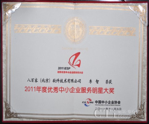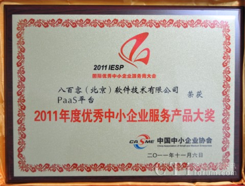 作為國內(nèi)首家SaaS廠商,八百客積極推動(dòng)云計(jì)算在中小企業(yè)中的宣傳與運(yùn)用。2006年,八百客在國內(nèi)率先推出管理自動(dòng)化開發(fā)平臺800APP, 它擴(kuò)展了按需服務(wù),并實(shí)現(xiàn)了客戶可根據(jù)需要自定制應(yīng)用程序,成為了改變應(yīng)用程序開發(fā)的一個(gè)新途徑。為表彰八百客在中小企業(yè)信息化中做出的杰出貢獻(xiàn),本次大會特別為八百客頒發(fā)了“2011年度優(yōu)秀中小企業(yè)服務(wù)產(chǎn)品大獎(jiǎng)”,此外還授予八百客總經(jīng)理李智 “2011年度優(yōu)秀中小企業(yè)服務(wù)明星大獎(jiǎng)”。