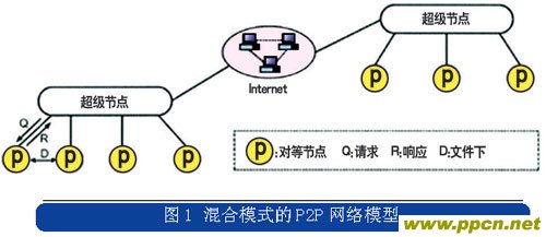 Skype是P2P技術(shù)演進(jìn)到混合模式后的典型應(yīng)用,它結(jié)合了集中式和分布式的特點(diǎn),在網(wǎng)絡(luò)的邊緣節(jié)點(diǎn)采用集中式的網(wǎng)絡(luò)結(jié)構(gòu),而在超級節(jié)點(diǎn)之間采用分布式的網(wǎng)絡(luò)結(jié)構(gòu),混合模式的P2P網(wǎng)絡(luò)模型如圖1所示。