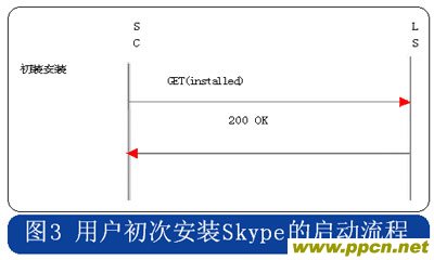 Skype的用戶終端啟動(dòng)時(shí),采用HTTP協(xié)議連接到注冊服務(wù)器,用戶初次安裝的啟動(dòng)流程中攜帶“installed”的參數(shù),使用時(shí)啟動(dòng)流程則在消息中攜帶“getlatestversion”參數(shù),具體流程分別見圖3和圖4。