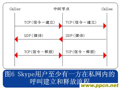 從上述流程圖可見,Skype的呼叫信令都采用TCP封裝,而媒體流則使用UDP封裝,當(dāng)有任何一方用戶位于限制UDP包的防火墻內(nèi)時(shí),媒體流就會(huì)采用TCP封裝。另外當(dāng)Skype用戶至少有一方位于私網(wǎng)內(nèi)時(shí),所有的信令和媒體消息都經(jīng)過一個(gè)或多個(gè)中間節(jié)點(diǎn)轉(zhuǎn)發(fā)。此時(shí)無需擔(dān)心用戶通話的媒體流因?yàn)榻?jīng)過中間節(jié)點(diǎn)轉(zhuǎn)發(fā)而被竊聽,因?yàn)镾kype采用了對消息進(jìn)行端到端加密的機(jī)制。