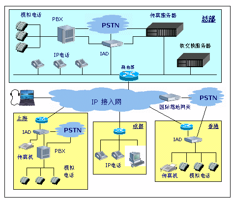 要通過互聯(lián)網(wǎng)(內(nèi)部數(shù)據(jù)網(wǎng))建設(shè)IP電話、傳真網(wǎng)絡(luò),各級辦公機構(gòu)需要配置網(wǎng)絡(luò)電話終端IAD,設(shè)備支持任意互聯(lián)網(wǎng)線路(ADSL\ISDN\DDN等),支持互聯(lián)網(wǎng)和內(nèi)網(wǎng)上的即插即用,支持放火墻\私網(wǎng)的穿透,真正實現(xiàn)能"上網(wǎng)就能打電話"。
