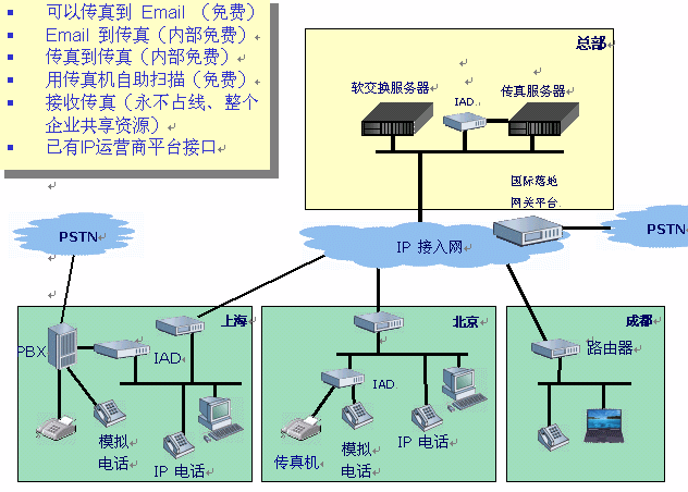 隨著Internet寬帶網(wǎng)絡(luò)和IP信息技術(shù)的日益普及,集團/企業(yè)的各級辦公機構(gòu)普遍接入了Internet寬帶網(wǎng)絡(luò),部分還在各級辦公機構(gòu)間建立了IP數(shù)據(jù)專網(wǎng)。通過互聯(lián)網(wǎng)(或內(nèi)部數(shù)據(jù)專網(wǎng)),可以建立覆蓋各辦公機構(gòu)的內(nèi)部IP電話、傳真網(wǎng)絡(luò)與電子化傳真,使企業(yè)各級機構(gòu)內(nèi)部通信"零話費"。