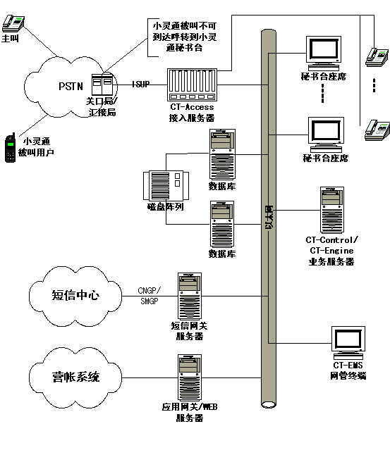 如上圖所示,小靈通秘書臺網(wǎng)絡(luò)拓撲圖,上圖中紅色虛線的左邊為運營商部分,紅線是接口部分, 紅色虛線的右邊是增加的小靈通秘書臺設(shè)備和工程實施部分。首先需要在小靈通網(wǎng)絡(luò)的關(guān)口局或者匯接局設(shè)置被叫不可到達(關(guān)機、忙、不在服務(wù)區(qū))呼叫前轉(zhuǎn),通過ISUP協(xié)議呼叫到小靈通秘書臺的CT-Access接入服務(wù)器,提取主叫號碼、被叫號碼、原被叫號碼,同時給主叫播放語音,"您撥的用戶無法接通,您可以選擇失話復得業(yè)務(wù),本業(yè)務(wù)每條短信收費0.1元,漏話提示請按1號鍵,短信回叫請按2號鍵,轉(zhuǎn)人工請按9號鍵"。然后根據(jù)主叫的響應選擇提供服務(wù)(業(yè)務(wù)流程見第3章)。小靈通秘書臺的業(yè)務(wù)部分由CT-Control/CT-Engine業(yè)務(wù)服務(wù)器和數(shù)據(jù)庫服務(wù)器組成,另外包括人工臺和短信網(wǎng)關(guān),短信網(wǎng)關(guān)通過CNGP(網(wǎng)通)、SMGP(電信)和短信中心網(wǎng)關(guān)接口,實現(xiàn)短信發(fā)送功能。業(yè)務(wù)網(wǎng)關(guān)和WEB服務(wù)器為可選部分,根據(jù)業(yè)務(wù)需要選配。