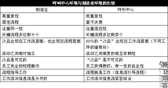 在呼叫中心的環(huán)境下,業(yè)務(wù)流程的類型主要是“Workflow”。但在流水作業(yè)的制造業(yè)環(huán)境下,“Work process”則是主要的類型。再也清楚不過了:這兩種工作現(xiàn)場環(huán)境是很不一樣的。