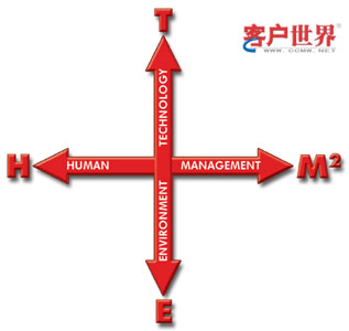 THEM2方法把呼叫中心看成是由技術(shù)(Technology)、人(Human)、環(huán)境(Environment)、管理(Management)組成的整體。這個(gè)方法的圖示是一個(gè)十字架(見(jiàn)圖一),M之上的2字的意思是說(shuō),所考慮的管理包括戰(zhàn)略管理(Strategic Management)和運(yùn)營(yíng)管理(Operational Management)兩個(gè)層面。