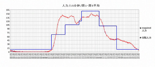 要用EXCEL畫這樣的比較圖,其實(shí)不難。因?yàn)槠饺蘸图偃盏碾娫捔磕P筒灰粯,所以一般會畫兩張,一張是平日的電話量和人力比較,一張是假日的電話量和人力比較。下面就是一張平日的電話量和人力比較圖,一天24小時(shí)的情況。紅色的是每隔15分鐘的電話量,藍(lán)色的是實(shí)際安排的人力。