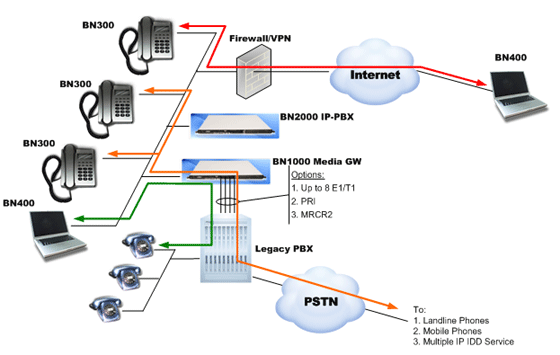 IP-PBX具有強大的動態(tài)路由選擇功能。將BN2000IP-PBX與BN1000網(wǎng)關配合使用,傳統(tǒng)PBX管轄下的每個模擬電話就會變身為BN300