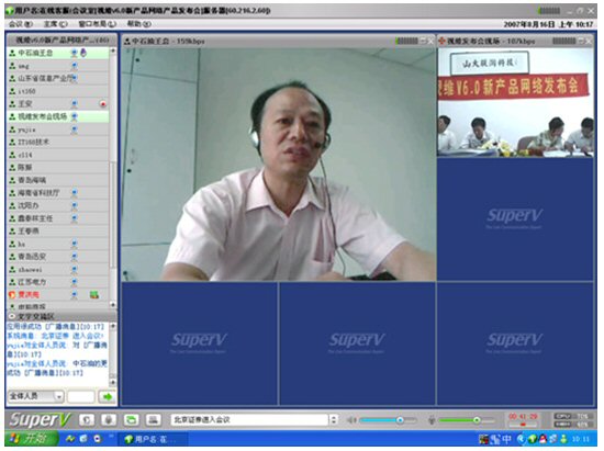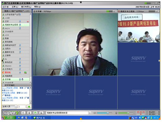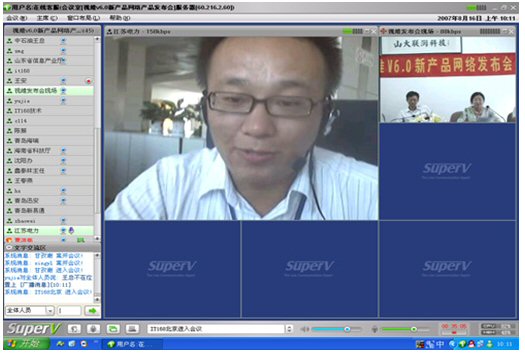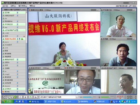 2007年8月16日,視維視頻會(huì)議V6.0新產(chǎn)品網(wǎng)絡(luò)發(fā)布會(huì)在美麗的泉城濟(jì)南舉行,山東省信息產(chǎn)業(yè)廳、濟(jì)南市信息產(chǎn)業(yè)局的領(lǐng)導(dǎo)、山東省電信等上級(jí)主管部門領(lǐng)導(dǎo),視維產(chǎn)品新老用戶和有視頻會(huì)議需求的潛在客戶,國(guó)內(nèi)外合作伙伴,IT168、中國(guó)計(jì)算機(jī)報(bào)、電腦商報(bào)、C114、支點(diǎn)網(wǎng)、計(jì)算機(jī)世界、CTI論壇、投影時(shí)代等國(guó)內(nèi)知名媒體100多人參加了這次網(wǎng)絡(luò)發(fā)布會(huì)。在此次會(huì)議上,山大聯(lián)潤(rùn)公司通過視頻會(huì)議與各地與會(huì)者進(jìn)行了良好的溝通,同時(shí)這次發(fā)布會(huì)開創(chuàng)了用視頻會(huì)議發(fā)布新產(chǎn)品的先河。