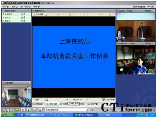 CTI論壇(ctiforum)08月06日消息: 日前,京九干線主力機(jī)務(wù)段——上海鐵路局阜陽(yáng)機(jī)務(wù)段成功啟動(dòng)視維Super-V視頻會(huì)議系統(tǒng)。阜陽(yáng)機(jī)務(wù)段的領(lǐng)導(dǎo)和職工,每天早上8點(diǎn)上班后,第一件事情就是登陸視頻會(huì)議系統(tǒng),匯報(bào)前日工作情況、部署當(dāng)日工作內(nèi)容。已然,山大聯(lián)潤(rùn)為上海路局阜陽(yáng)機(jī)務(wù)段部署的阜陽(yáng)機(jī)務(wù)段視頻會(huì)議系統(tǒng),成為鐵路部門(mén)必不可少的遠(yuǎn)程溝通交流工具,在有效提高鐵路系統(tǒng)溝通效率的同時(shí),保障了鐵路運(yùn)輸?shù)陌踩瑯O大滿(mǎn)足了鐵路部門(mén)暑期運(yùn)營(yíng)業(yè)務(wù)對(duì)溝通和會(huì)議的需求。