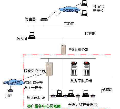 數(shù)據(jù)通信局的客戶遍布全國各地,建立一個覆蓋全國的客戶服務網(wǎng)絡勢在必行,因此我公司為之構(gòu)建了數(shù)據(jù)通信局客戶服務系統(tǒng),全國各地的各個客服中心的數(shù)據(jù)可以通過專線連接,語音也可以通過VOIP用數(shù)字專線連接,以降低長話費用。該系統(tǒng)的投入使用,不但滿足了數(shù)據(jù)局為全國各地客戶服務的需要,而且可以收集客戶信息,不但降低了辦公費用,而且有利于擴大市場分額。數(shù)據(jù)通信客戶服務中心的主要目的是解決對全國大客戶的業(yè)務咨詢與申辦、障礙申告、投訴與建議的集中管理以及處理控制,系統(tǒng)采用800號接入,以一個小型的交換設備為座席電話分配點,客戶撥入的電話,經(jīng)小型交換設備分配到空閑的座席上。