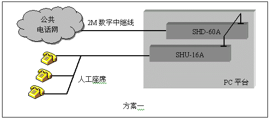 通道數(shù)較多的大中型應(yīng)用系統(tǒng),一般采用數(shù)字中繼線(E1)接入公共電話網(wǎng),三匯公司的SHD系列數(shù)字中繼卡可以提供相應(yīng)的解決方案。SHD系列數(shù)字中繼在一塊卡上集成了E1線接口,語(yǔ)音資源,信令處理等所必須的全部功能,其接入信令處理模塊可處理中國(guó)1號(hào)信令(SS1),7號(hào)信令(SS7),ISDN PRI協(xié)議(DSS1),單塊卡最多可支持4個(gè)E1接入。通過(guò)CT-BUS(或ST-BUS)總線,還可以在數(shù)字中繼線上實(shí)現(xiàn)傳真功能。典型應(yīng)用結(jié)構(gòu)如下圖: