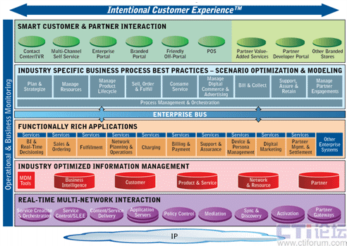 其次,CES改變了現(xiàn)有的業(yè)務應用層將功能和流程融合在一起的模式,對流程和功能進行了分離。實際上,應用功能和流程結合得越緊密,系統(tǒng)的適應性就會越差,對新業(yè)務和新產品的響應時間就越長,CES將業(yè)務應用層分為流程層和應用功能層,流程和功能的分離極大的提高了系統(tǒng)靈活性,降低了系統(tǒng)集成的復雜程度和成本開銷,滿足了新業(yè)務和新產品快速上市的要求。在流程層,運營商不僅可以選擇采用Amdocs在25年服務經(jīng)驗的基礎上總結的業(yè)界最佳實踐的業(yè)務流程,也可以選擇采用企業(yè)現(xiàn)有的業(yè)務流程;在應用功能層,Amdocs全系列軟件產品將更加模塊化,運營商可以選擇Amdocs全系列軟件產品,也可以選擇其中的個別或部分產品,這種高度模塊化的產品將以更快的速度集成到運營商已有的IT框架中。